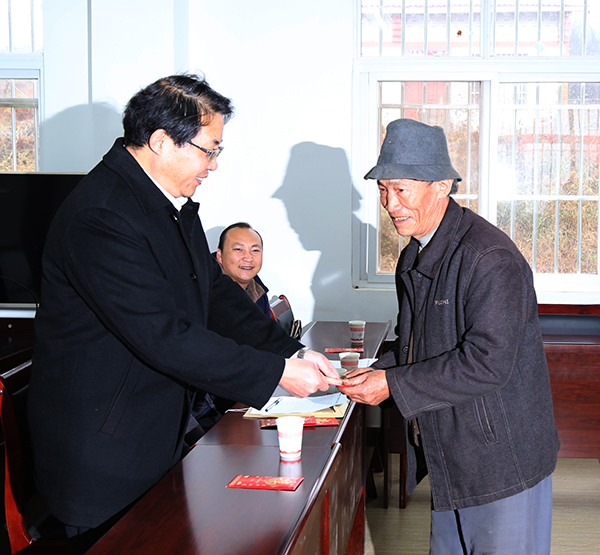 12月5日,学校到“挂包帮”联系点会泽县者海镇拖木村举行贫困大学生慰问活动,党委书记、学校脱贫工作领导小组组长李国疆,者海镇党委书记柳江出席活动并讲话。校长、学校脱贫工作领导小组组长浦虹,党委副书记、学校脱贫工作领导小组副组长王志刚,党委副书记陆选荣,副校长李莉,纪委书记徐显敏,副校长张永刚分别为11名大学生家长发放了生均2000元的慰问金。副校长、学校脱贫工作领导小组常务副组长毛辉主持慰问活动。